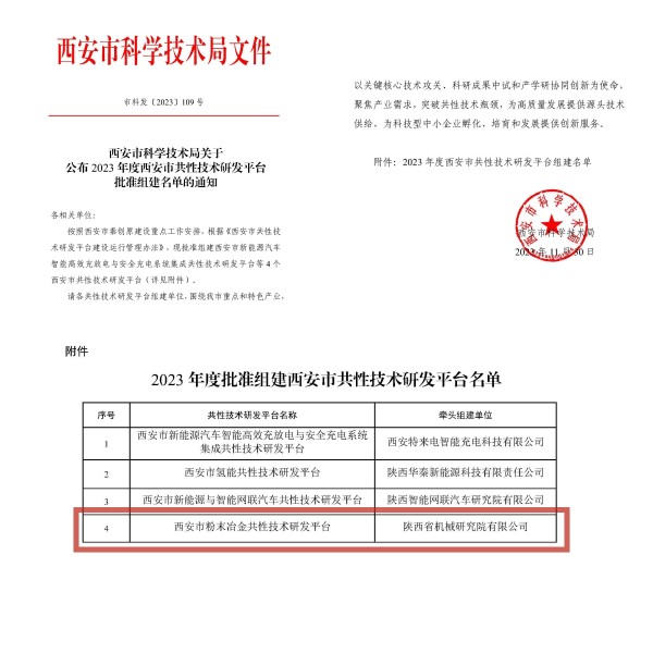 近日,西安市科學(xué)技術(shù)局發(fā)布通知,批準(zhǔn)組建4個(gè)西安市共性技術(shù)研發(fā)平臺。集團(tuán)所屬機(jī)械院牽頭組建的“西安市粉末冶金共性技術(shù)研發(fā)平臺”成功入選!
